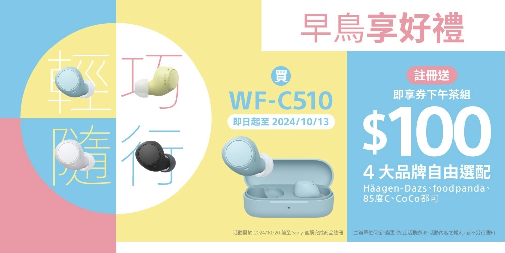 WF-C510 是日常使用的理想選擇,搭載多點連線、環境音效模式和 EQ 自訂功能,讓聆聽體驗更豐富多變。