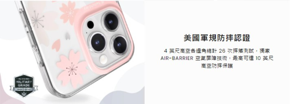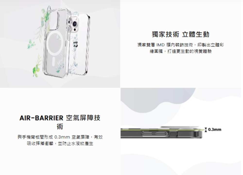 ◆0.3mm AIRBARRIER 設計,將手機背板形成 0.3mm 空氣屏障空間氣囊,可有效吸收摔落衝 擊,並防止水波紋產生